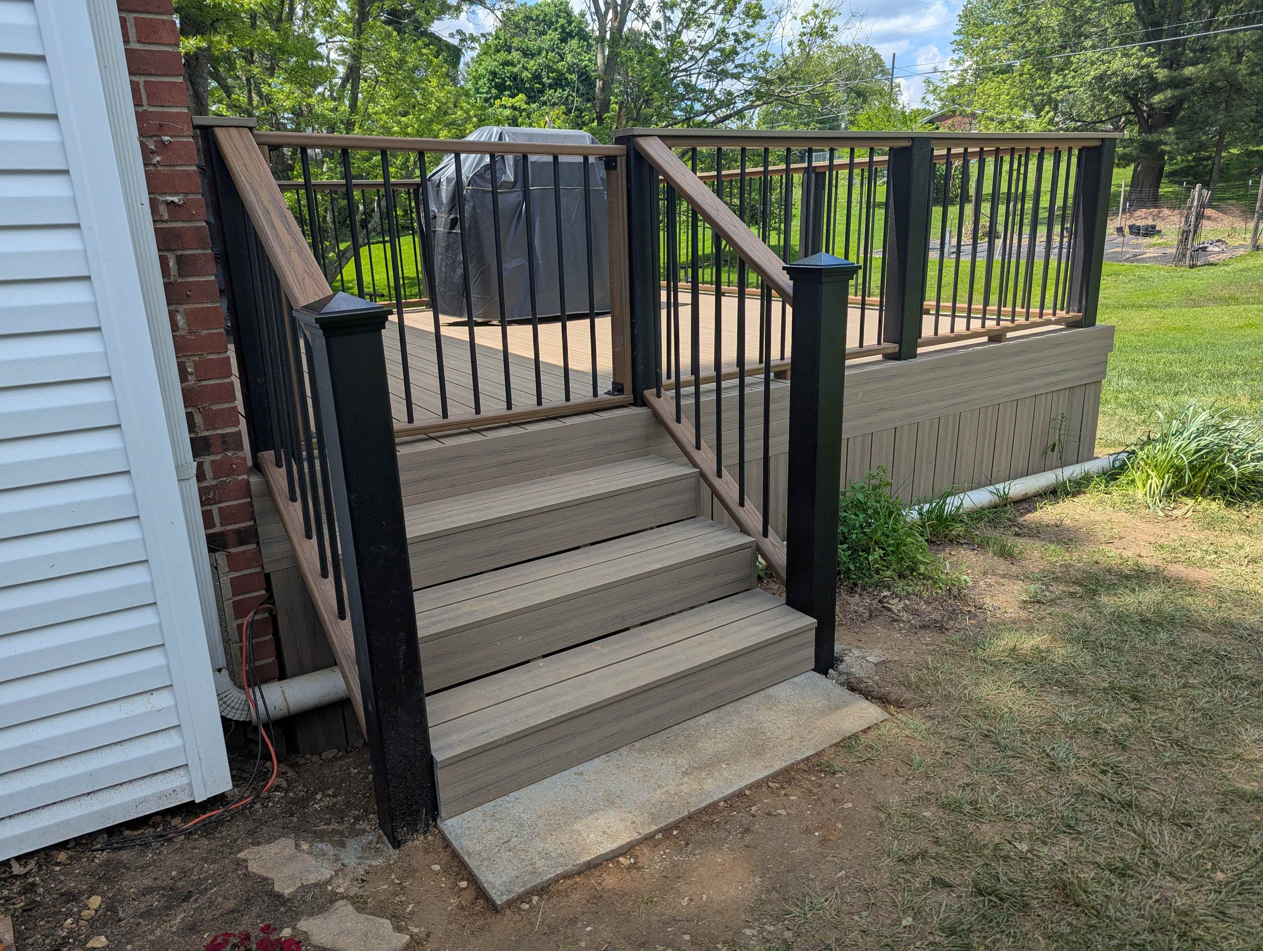 Grace after. Trex 2 toned decking and kickplate with a black aluminum handrail.