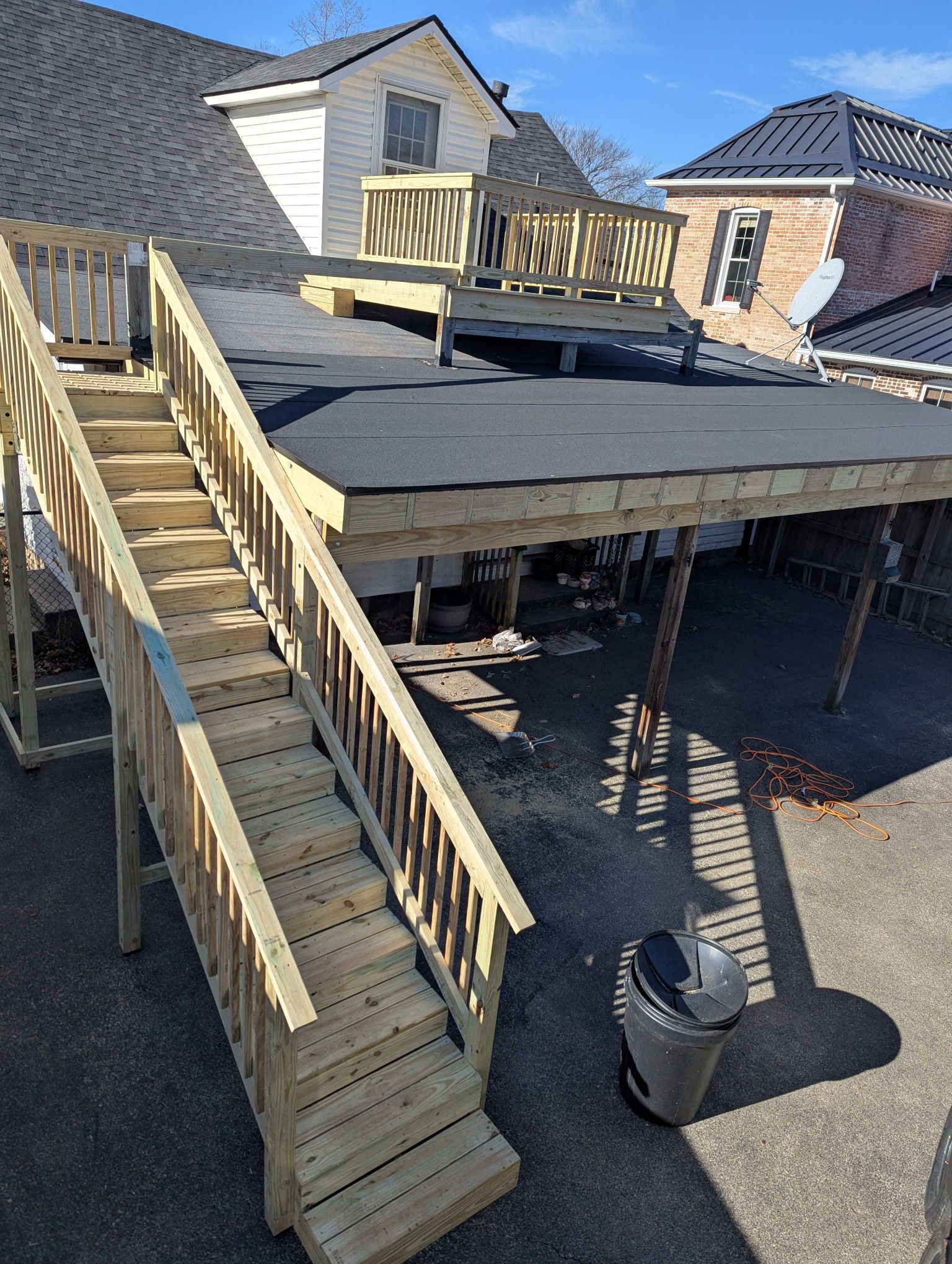 Gerald had rotting decking boards and joist's that covered the carport area, but didn't protect it from the rain. He had a smaller, unsafe platform deck on the roof and no stairs to access anything. We tore out all of the roofing material and built a low sloped roof with rolled roofing that matched what he already had (the roof that is beneath the deck top roof). We also rebuilt the deck on the roof, making it where he could walk straight out of his door (you can see the top of the door, but the railing somewhat blocks it) and added railing and a step to safely access the rooftop and then built stairs in order for him to have a private entrance to the upstairs area of the home.